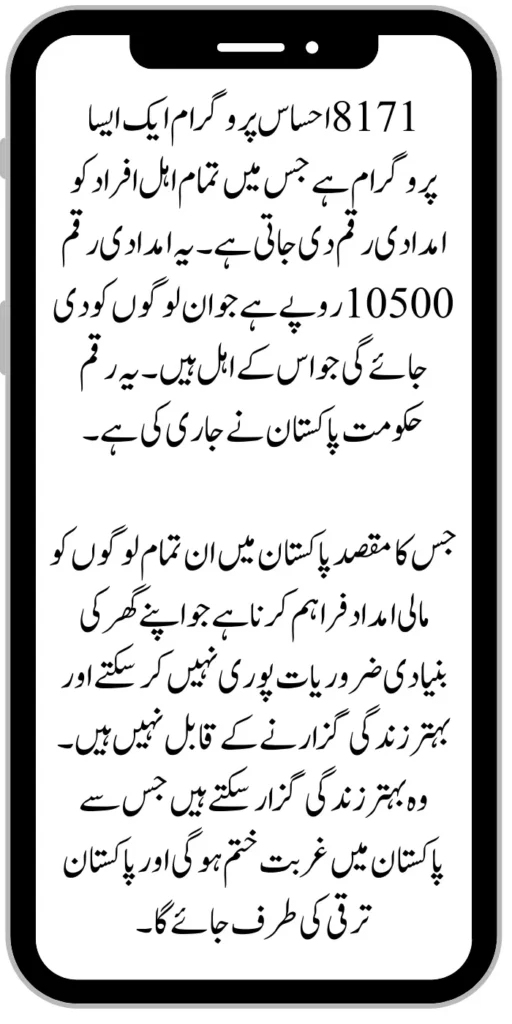 8171 Ehsaas Program is a program in which all eligible people are given assistance money. This assistance amount is 10500 rupees which will be given to those people who are eligible for it.This amount has been released by the government of Pakistan.